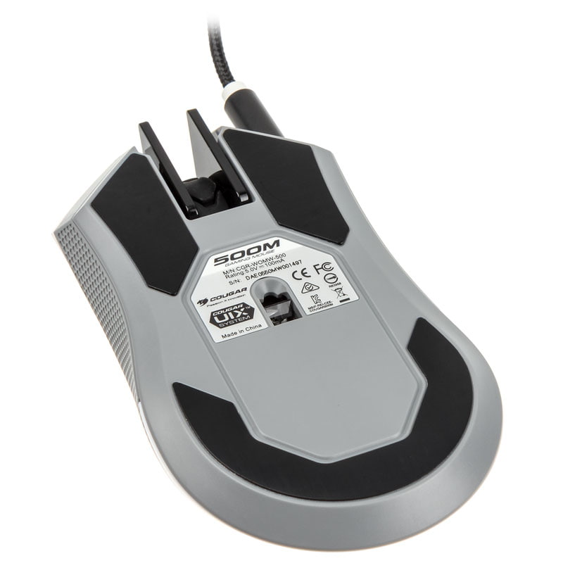 Die 500M besitzt mit ihrem Mausrad, zwei Haupt- und zwei Daumentasten sowie einer Taste hinter dem Mausrad insgesamt sechs programmierbare Buttons. Cougars UIX-Software sowie drei in der Maus selbst hinterlegbare Profile ermöglichen eine äußerst weit gehende Anpassung an die eigenen Bedürfnisse hinsichtlich der Tastenbelegung und der Beleuchtung. Die langlebigen Gaming-Tasten von Omron erlauben mindestens 5 Mio. Klicks und der Nager wird über ein 1,8 Meter langes, für maximale Haltbarkeit ummanteltes USB-Kabel am PC angeschlossen.